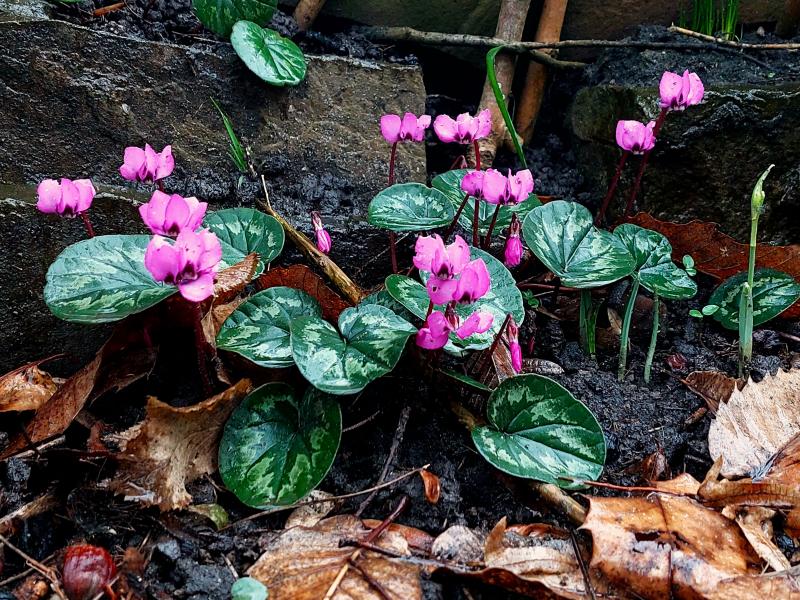 Cyclamen coum, Sämling vor Wegeinfassung.