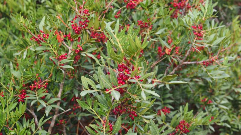 wow, nach dem Namen habe ich letztens gesucht! Mastixstrauch, Pistacia lentiscus, begleitet die Küstenwege, Sentier du Littoral in Frankreich. Foto vom 27. September 2016.