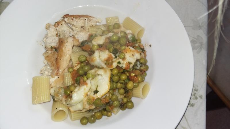 Hähnchenbrustfilet mit Tomaten, Erbsen und Mozzarella aus dem Ofen, dazu Mezzi Rigatoni. Genial lecker. :D