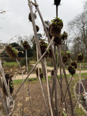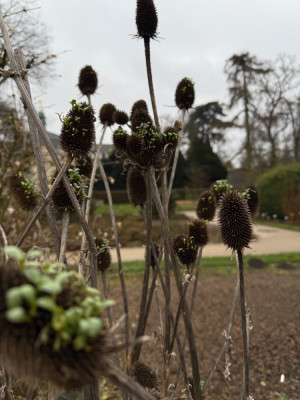 Dipsacus pilosus ist tatsächlich übel wehrhaft, aber einfach traumhaft schön. Hier haben sie letzte Saison 2,70m Höhe geschafft (siehe "feuchtes Jahr"), jetzt zieren die perfekt kugeligen Samenstände (auch schön für Adventsfloristik) und die Distelfinken sind Dauergäste.