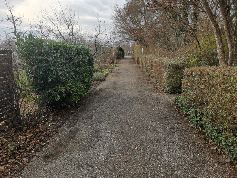 Ich nutze für diesen und angrenzende Wege Gartenwiesel, wie sie im Bild sind. Die Pendelhacke nicht, da sie die Unkräuter nicht sauber von der anhaftenden Erde befreit und auch nicht sauber an der Oberfläche ablegt.