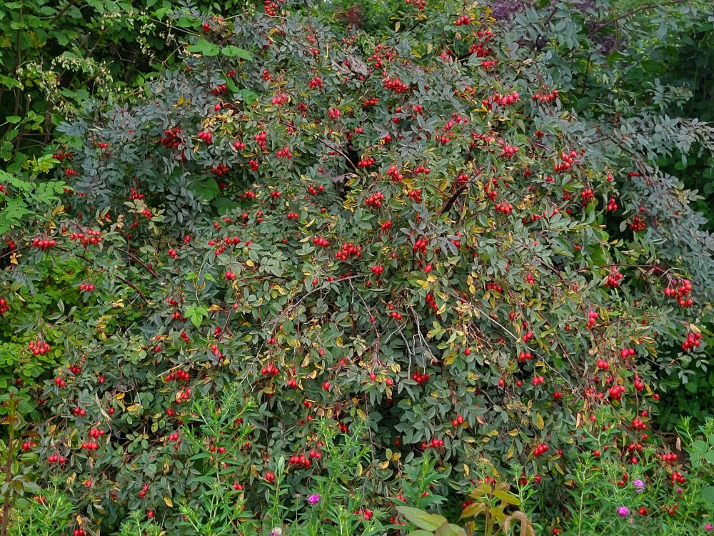 R.glauca hat tatsächlich einen sehr reichen und sich relativ früh zeigenden Hagebuttenansatz.