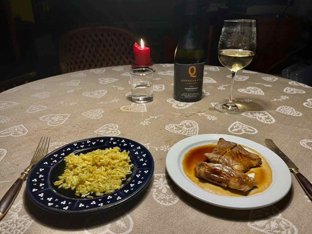 Kabeljau-Filets, asiatisch mariniert und gedämpft sowie Safranrisotto zum Chardonnay 2021 aus Niagara-on the Lake, Kanada