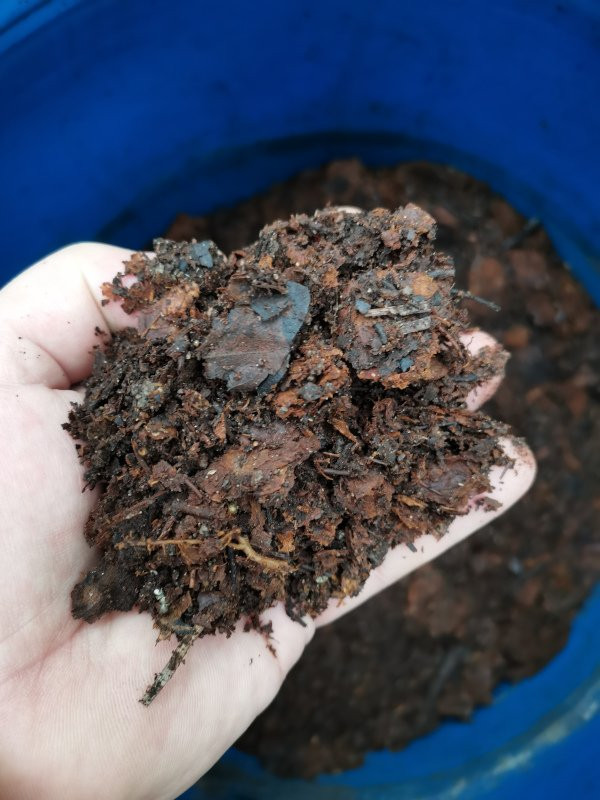 Die Wurzel will also immer irgendwo entlang wachsen. Laubkompost hat dann den Effekt mit dem langen Kanal, wenn es noch `Pappen´ gibt, die ausreichend porös, aber noch stabil genug sind. Wie auf dem Bild die etwas gröberen Teile.