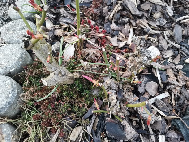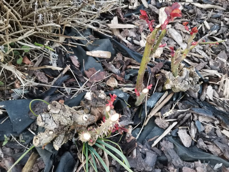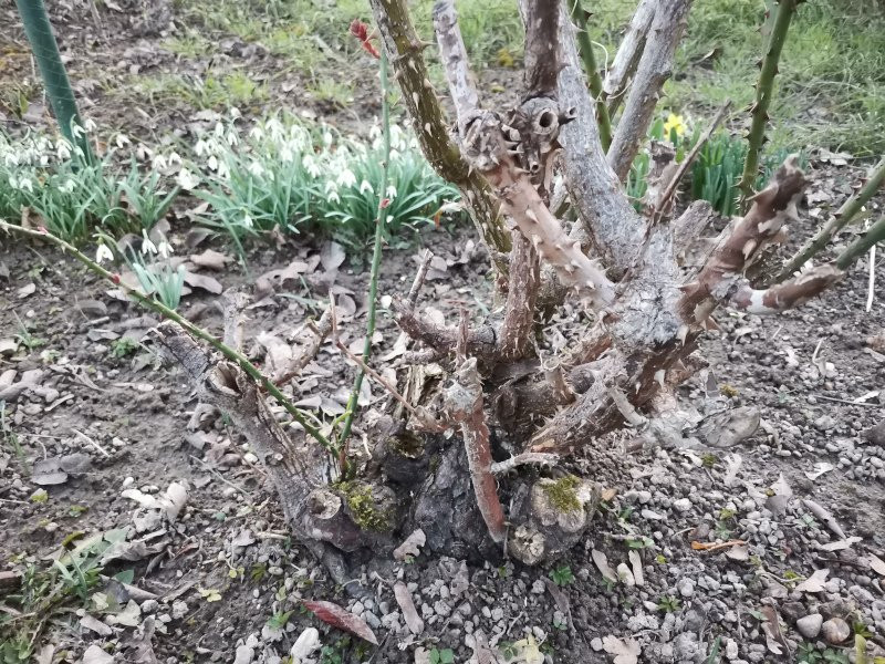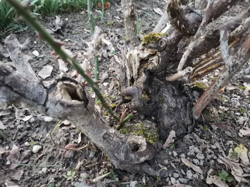 Gelegenheit, auch sehr alte Rosenstöcke mit zu verpflanzen, hatte ich schon öfter. Überalterte Triebe wurden dabei so tief wie möglich an der Basis heraus geschnitten oder abgesägt, von jüngeren, vitalen Trieben drei bis fünf stehen gelassen und entsprechend der geborgenen Wurzelmasse eingekürzt.