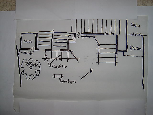 Hallo findling,nein nicht ganz. Wenn ich die skizze zur Erklärung nehme, dann soll die re. Pergola unter den Balkon mit den 2 Metallpfeilern. Die li. Pergola ist ganz auf der li. Seite, angelehnt an einen gemauerten ehemaligen Hühnerstall. Das Foto zeigt in die Ecke, in die ein Podest zwangsläufig muß, zum Höhenausgleich der Terassentür.Der sogenannte Innenhof hat die Breite von ca. 10 m