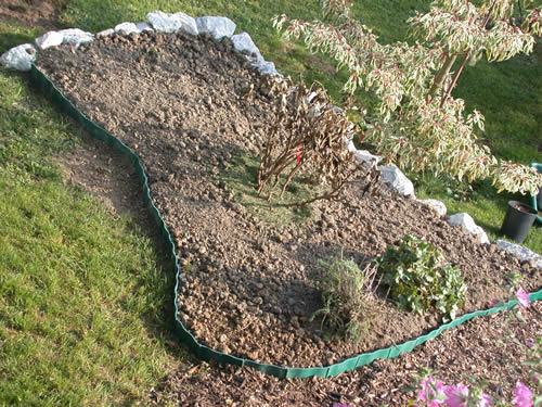 ja brennessel, ist alles handarbeit; bei den großen steinen mußten halt die männlichen teile der verwandtschaft herhalten, die kleineren hab ich dann alleine eingefügt und die wellenform ausgebildet...auch die erde aufgefüllt und die bepflanzung haben wir selbst gemacht; es liegt ein harter arbeitssommer hinter uns, soviel steht fest; und nä. jahr geht`s weiter...aber psssst, das weiß gg ja noch nicht, soll eine überraschung sein