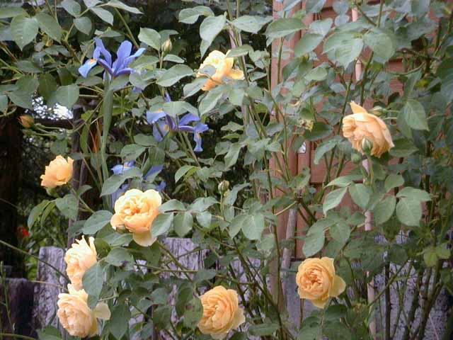 Und wunderschön zu gelben Rosen sind auch Iris, obwohl nicht so richtig violett sondern mehr blau. Nicht zu vergessen: Glockenblumen! Gehören für mich (wie Clematis) einfach zu Rosen.