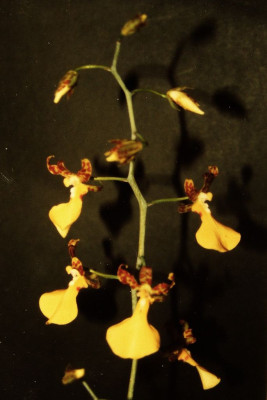 Mit der wachsenden Erfahrung traute ich mich auch an andere Sachen. Einfach war zum Beispiel diese Hybride Oncidium concolor x flexuosum, die wegen des letztgenannten Elternteils gerne herumklettert (d.h. die Pseudobulben stehen am Rhizom um einiges auseinander) und deshalb als eine meiner ersten Orchideen nur noch am Block kultiviert wurde. Das geht auch im Zimmer: ein- bis zweimal in der Woche in einer Schüssel baden (und gut abtropfen lassen vor dem Wiederaufhängen