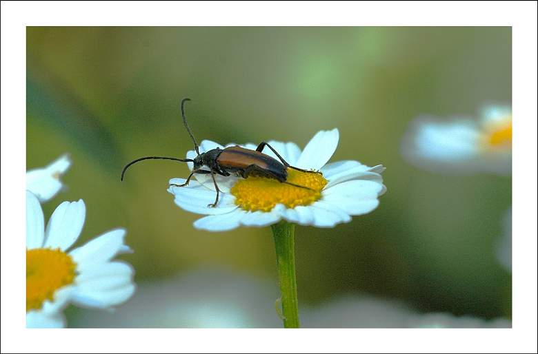 Frank,ich denke, es ist ein Geschwärzter Schmalbock (Strangalia melanura).Gruß ChristaWie heißt der Besucher des Mutterkrautes?!
