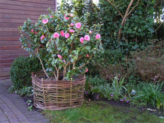 Und dann habe ich eine große Kamelie in eine Maurerbütt gepflanzt. Da das nicht so hübsch war, bekam sie auch ein Weidenflechtgewand: