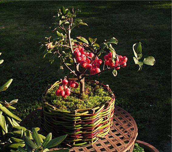 Hier noch ein Apfel-Bonsai im selbstgeflochtenen Körbchen: