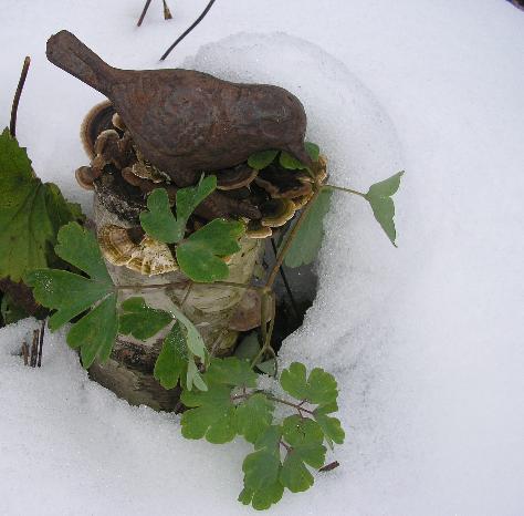 So schaut meine Aquilegia vulgaris "William Guiness" zur Zeit aus. Sie hat ihren Platz am Fuße eines kleinen Birkenstockes, auf den ich einen Eisen- Vogel gesetzt habe. Ein Pilz hat inzwischen den ganzen Birkenstock überwuchert und langsam versucht er auch den Vogel zu erklimmen.