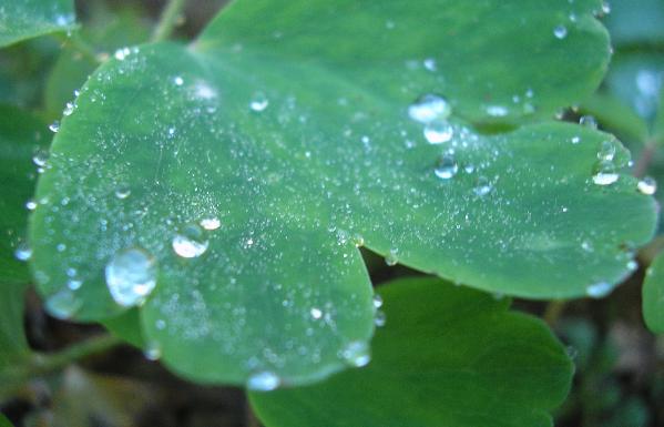 Was die variegaten und die goldlaubigen Akelein betrifft, so habe ich leider keine. Aber ich habe auch ein Foto vom Lotuseffekt. Gerade vor zwei Stunden gemacht und es zeigt gefrohrene Wassertropfen auf dem Blatt einer Aquilegia flabellata.