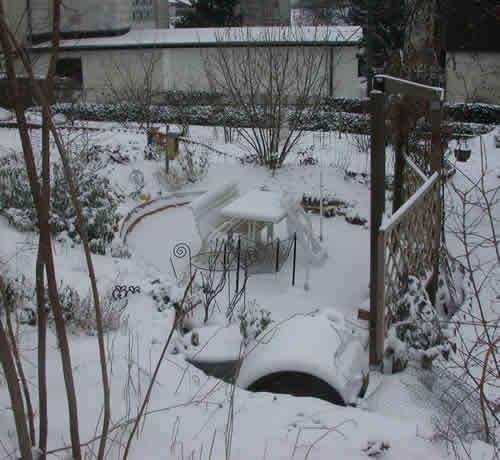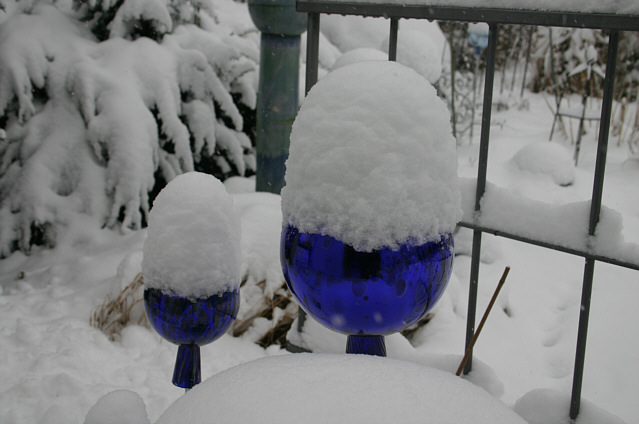 welch ein Kontrast von Franks makellos schönen Frühlingsblüten zu Elis eingeschneitem Garten