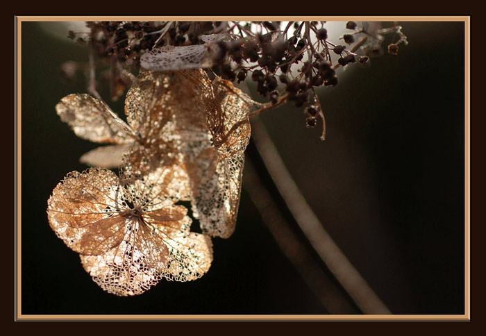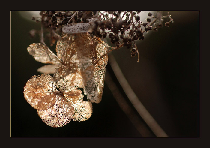 Irgendwie bekommt ein Bild mit einem Rahmen etwas mehr Gewicht, oder? Das hat macrantha doch schon mal so gut an einem Beispiel demonstriert. Bei den Hortensien im Gegenlicht geht es mir auch so.Gartenlady, die Farbgebung empfinde ich als eine passende Erweiterung des Bildes. Das Erhabene an dem Rahmen ist mir allerdings zuuu künstlich. Vielleicht würde ich den beigen Streifen auch ein wenig dünner machen.