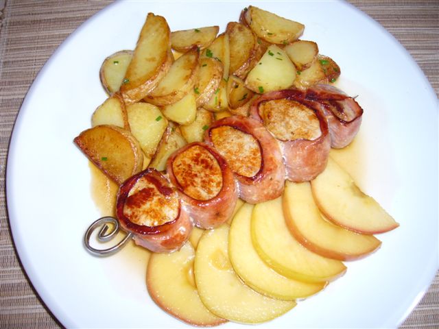 Zuerst gab es einen kleinen Teller mit Antipasti (Honig-Zwiebelchen, marinierte Paprika Aubergine und Zucchetti, Oliven, Sardellen) sie sind am Samstag übrig gebliebenFleisch-Spiesschen mit Äpfeln an einem Calvados-Jus dazu Bratkartoffeln
