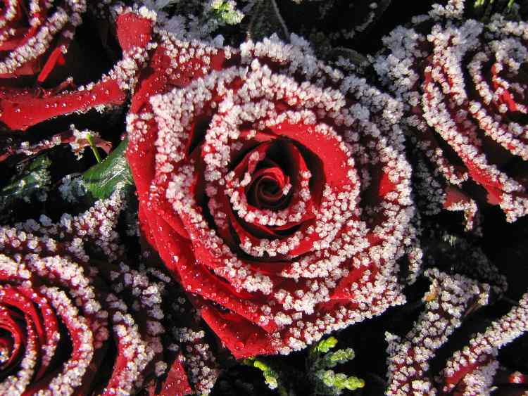 Als hätte man sie mit Hagelzucker verziert, sehen diese Rosen nach zwei Tagen starkem Frost im Freien aus. Derzeit ist alles beinhart gefroren. Wir verzeichnen nachts bis zu -11o C.Gruss Christa
