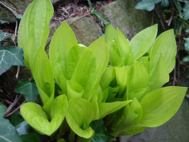 Eine interessante Blattfärbung im Austrieb hat Hosta 'Richland Gold' ,ein Sport von H.'Gold Standard'.