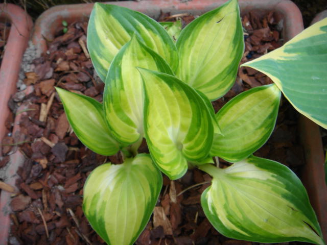 Kleinbleibend und schöne helle Flächen bildet Hosta 'Wogon Gold' ,der richtige Name lautet wohl H.'Ogon Koba'.