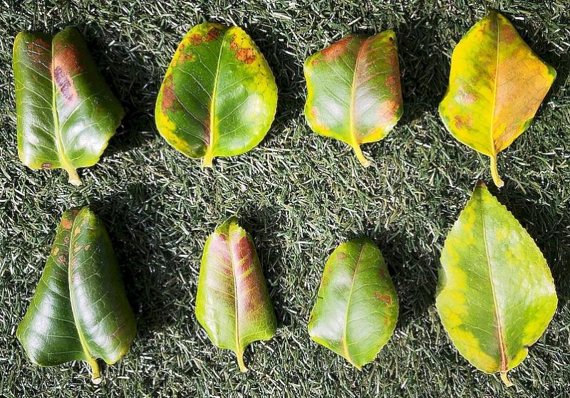 Neben den gezeigten schwarzen Rändern hat meine Kamelie jetzt auch angefangen, rot verfärbte Blätter zu bilden. Die braunen streifen in der Nähe des Stieles sind auch an der Unterseite braun durchgefärbt.