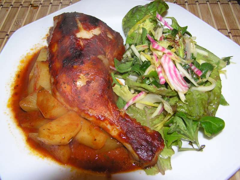 kartoffel-tomatenhähnchen aus dem ofen, dazu gartensalat mit bunter, geraspelter bete.