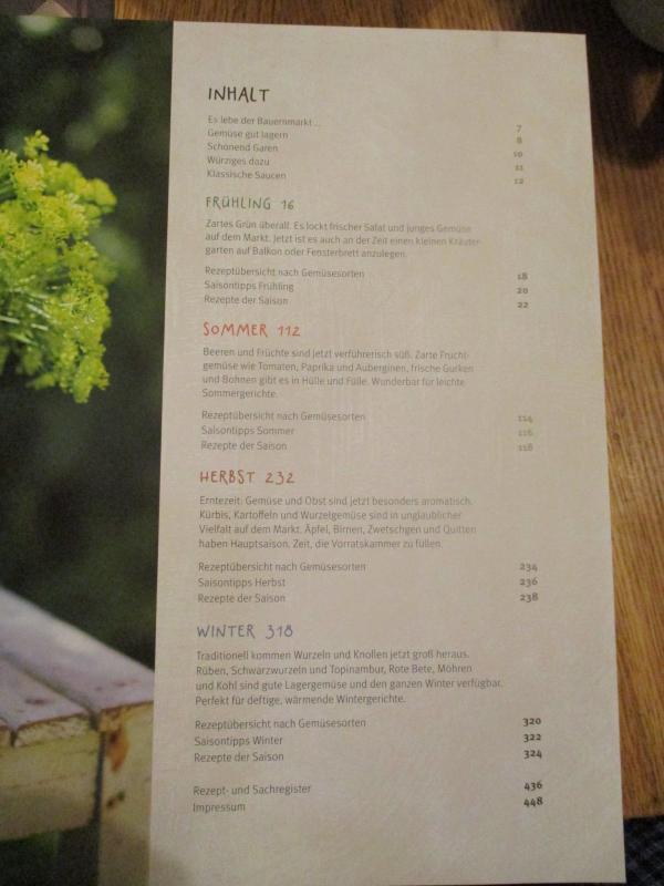 In der Papierversion findet man neben dem Inhaltsverzeichnis am Anfang des Buches (s. Bild) in jedem Kapitel (Frühling, Sommer, Herbst und Winter) die Rezeptübersicht sortiert nach Gemüsesorten sowie das ausführliche Register am Ende des Buches.