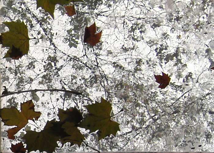 Köln ca. 13:00: Blätter auf nassem Dachfenster. Es regnet. Dahinter unscharf Zweige.November-GrüßeThomas