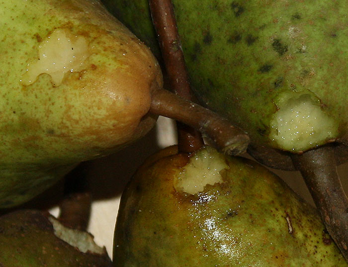 Das Wetter spielt eine grosse Rolle, wie ich jetzt bei den Hausgartenbäumen erneut gesehen habe. Bei Sonne und Wärme liessen die Schäden nach, beim gestrigen Regen fing die Pickerei sofort wieder an. Die gefiederten Ratten setzen sich auf einen Ast und alle von dort erreichbaren Birnen werden angepickt. Reingepickt, nächste Birne, nichts fressen, nur picken, siehe Bild.Das sieht aus wie wenn sie bei schlechtem Wetter auf winterliche Vogelfütterung umschalten und dicke Früchte als Meisenknödel behandeln. Man pickt rein,stellt dann fest: schmeckt nicht, wertlos. Nächster "Knödel". Solange, bis alles Erreichbare durchprobiert ist.