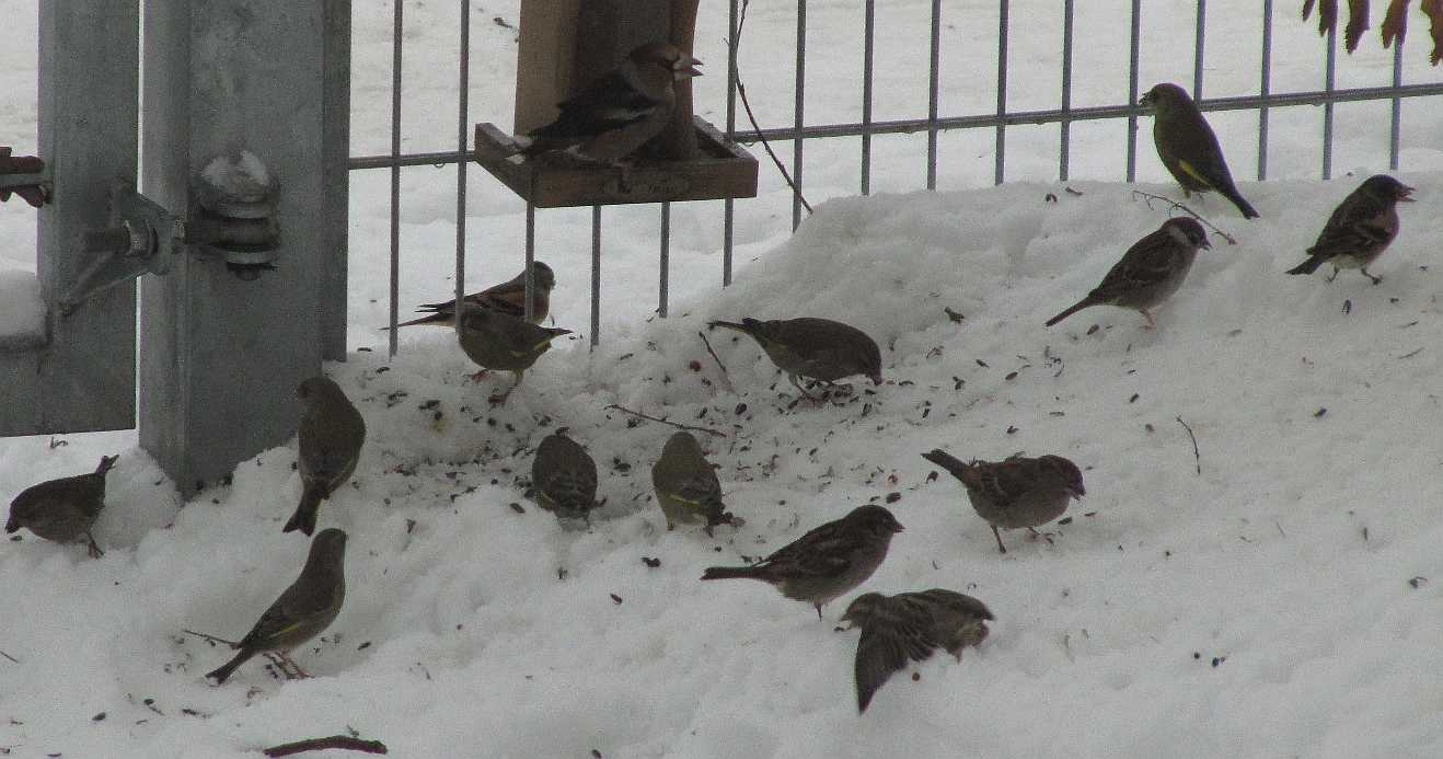 .Zum ersten Mal war heute richtig was los am Futterplatz ohne dass sofort auch Eichelhäher und Nebelkrähen zur Stelle waren. Leider ist das Foto (durchs Fenster fotografiert) nicht besonders gut. Ich habe identifiziert: Bergfing, Kernbeißer, Grünfink, Haussperling und Feldsperling.
