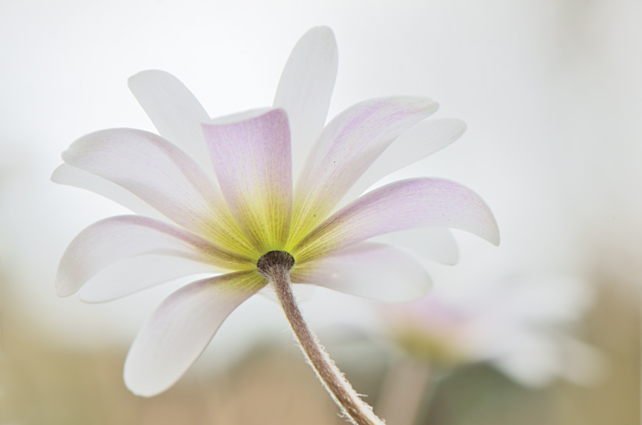 Die Blüten der weißen Anemone blanda animieren mich immer zu einem Ton-in-Ton-Foto vor hellem Himmel, auch heute wieder.Ich habe es anschließend recht stark aufgehellt, wollte es so hell wie möglich haben. Heute mal nicht mit Offenblende, sondern mit f10.