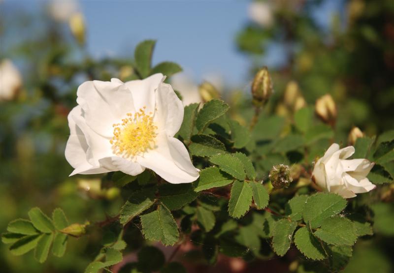 Hier blühen noch keine Rosen, haben noch nicht mal Knospen, treiben aber schon kräftig aus.Auf einer Rose habe ich Kahlfraß an einigen Blättern entdeckt und auch die Übeltäter: Zwei kleine grüne Raupen. An einer anderen waren einige wenige Blätter zusammengerollt, das größte habe ich zusammengedrückt und damit das Problem wohl vorerst gelöst. Solche rosenfeindliche Aktivitäten hätte ich bei dem langen trockenen Wetter nicht erwartet.