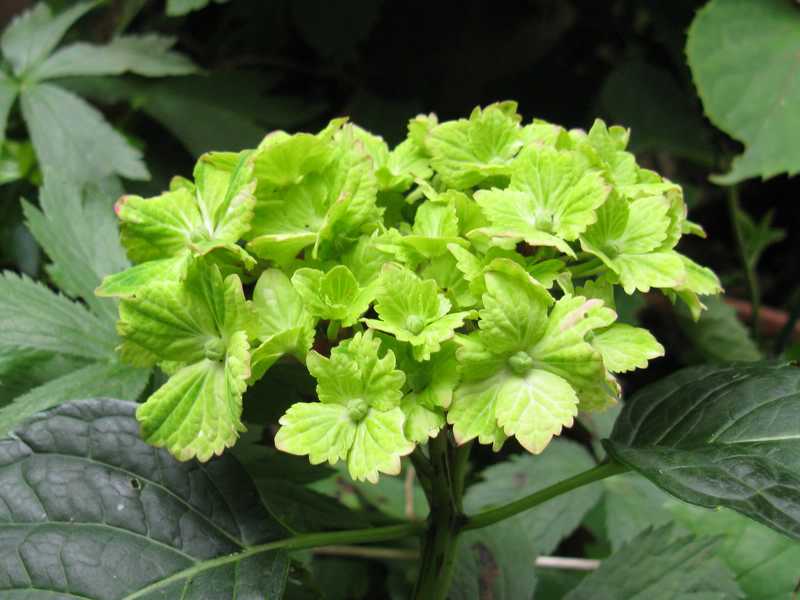 Zwei Neuzugänge bei den Bauerhortensien beginnen mit der Blüte.Zunächst H. macrophylla 'Shamrock'. Mal schauen, wie sich die Blüte wohl weiterentwickelt? Sie soll relativ winterhart sein.