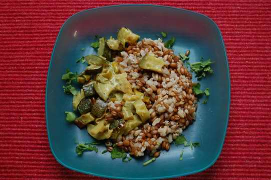 Zuckerhut klingt interessant. Schmeckt der auch süßlich?Heute gab es Bio-5-Korn-Getreide mit einem Zucchinicurry dazu. Die Anordnung ist nur so aus Jux entstanden, da solche "Spielereien" bei einem hungrigen 18 Monate altem Kleinkind völlig irrelevant oder sogar kontraproduktiv sind. Schade eigentlich