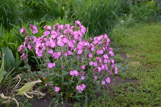 Silene dioica ist völlig unterschätzt. Sie bildet weiche Blattrosetten und blüht ab Ende April bis Juni, bei Rückschnitt auch später im Jahr immer wieder. Sie sät sich reichlich aus, aber weil die kleinen Pflanzen so eindeutig erkennbar sind, kann man sie leicht jäten (oder verpflanzen). Sie sind zwar groß, aber durchscheinend; große Beetstauden, die erst im Sommer blühen, haben kein Problem damit, wenn im Mai Silenen zwischen ihnen blühen.Potz, das Bild ist leider etwas blaustichig, die Blüten sind eigentlich blasslila und gehören zu Lunaria rediviva, der einheimischen Mondviole. Die nächste unterschätzt Art
