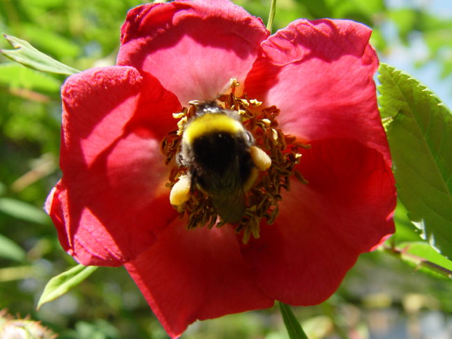 Wer Hummeln liebt und ihnen was Gutes tun möchte sollte R. moyesii pflanzen. Nichts zieht diese Viecher so sehr an. Geräuschkulisse als wenn man vor Bienenstöcken steht (ich habe Bienen und kann das beurteilen). Merkwürdigerweise sehe ich dort fast niemals eine Biene. Als die Büsche noch klein waren, haben sich die Hummeln um die Blüten gebalgt - 5 Hummeln auf einer Blüte waren nicht ungewöhnlich. Mittlerweile sind die Büsche recht groß geworden und es gibt für jeden was. Manch ein Viech hat die Hosen so voll, dass es kaum noch hochkommt.