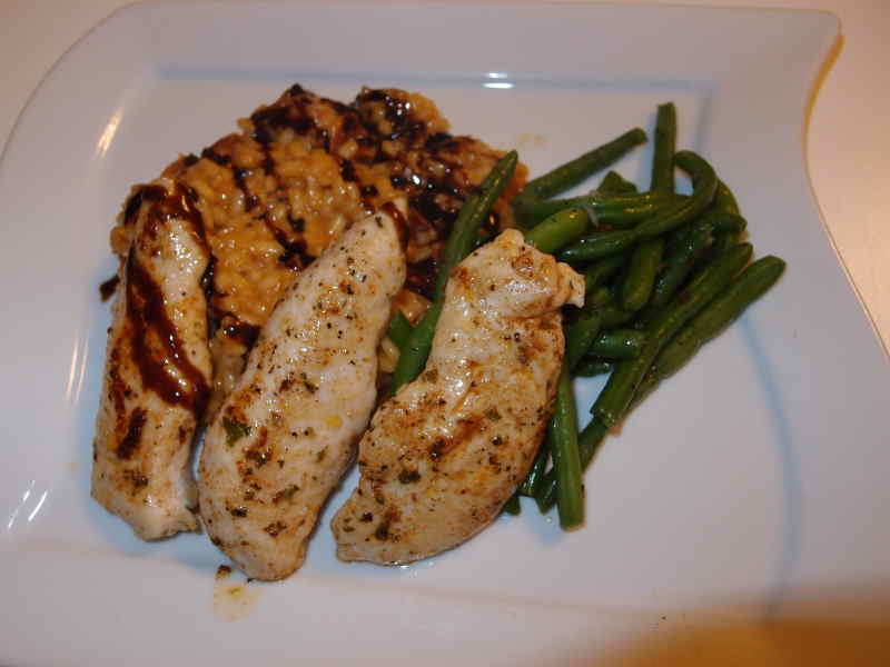 und gestern risotto mit getrockneten tomaten (und ein wenig tomatenmark für die farbe), hähncheninnenfilets und grüne bohnen.