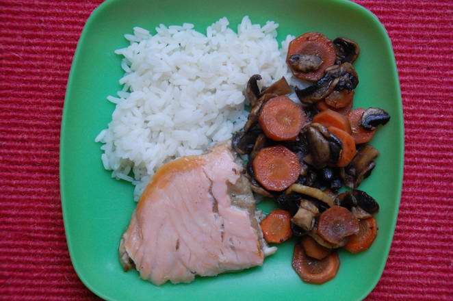 ) und Räucherlachs belegt. Dazu Reis und Möhren-Champignon-Gemüse.