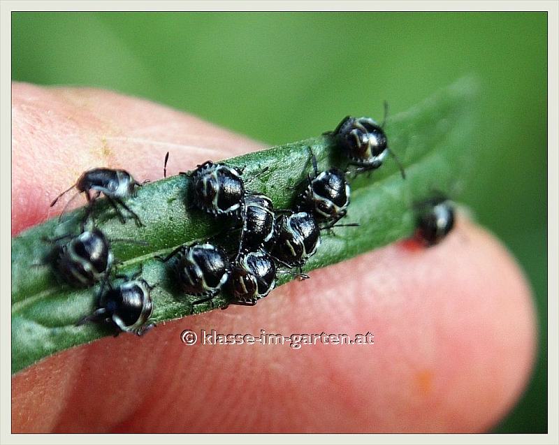Es sind auf jeden Fall irgendwelche Blattwanzen-Larven. Junge Kohlwanzen sehen so aus, das ist richtig.Deine Spinne ist ein so genannter Flachstrecker, ein noch unreifes Männchen einer Philodromus-Art (vielleicht Ph. emarginatus, aber das kann ich anhand eines Bildes nicht sicher sagen).