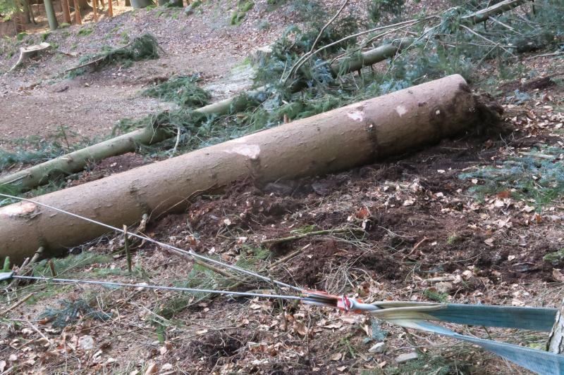heute sind die letzten Fichten den Kettensägen und der Schwerkraft erlegen...es kamen auch Seilzug und Umlenkrollen zum Einsatz, um bereits vorhandene Anpflanzungen möglichst zu schonen...im Bild pflügt sich ein Stamm gerade durchs ehemalige Farnbeet...