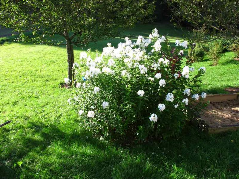 In meine Wiese habe ich immer wieder dort Stauden gesetzt, wo Rosen das Zeitliche gesegnet hatten und Lücken mit guter Erde waren. Nichts Aufregendes, aber sie haben sich bewährt und machen außer Abschneiden und ev. im Herbst ein paar Schaufeln Mist kaum Arbeit wie z.B dieser weiße Riesenphlox: