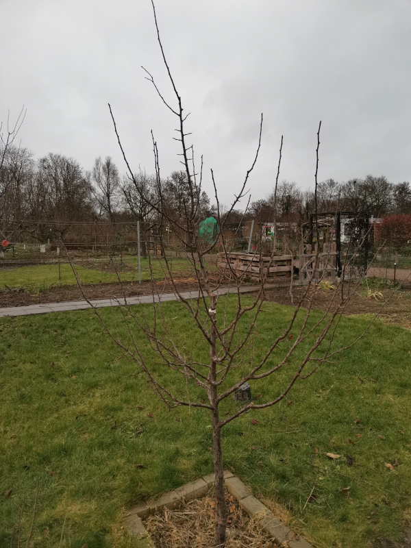 Im Bild eine Zwetschge lang geschnitten, wird auch um die 4m hoch werden. Kurzes Fruchtholz für gute Erträge war das ziel. Man könnte noch ein paar ganze Äste rausnehmen zwecks besserer Belichtung, aber die bleiben absichtlich drin weil so viel Schatten ists auch nicht und die Geschichte mit Sonnenbrand und Co wird ja auch nicht besser.