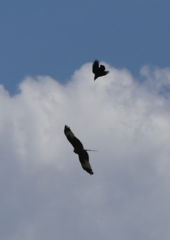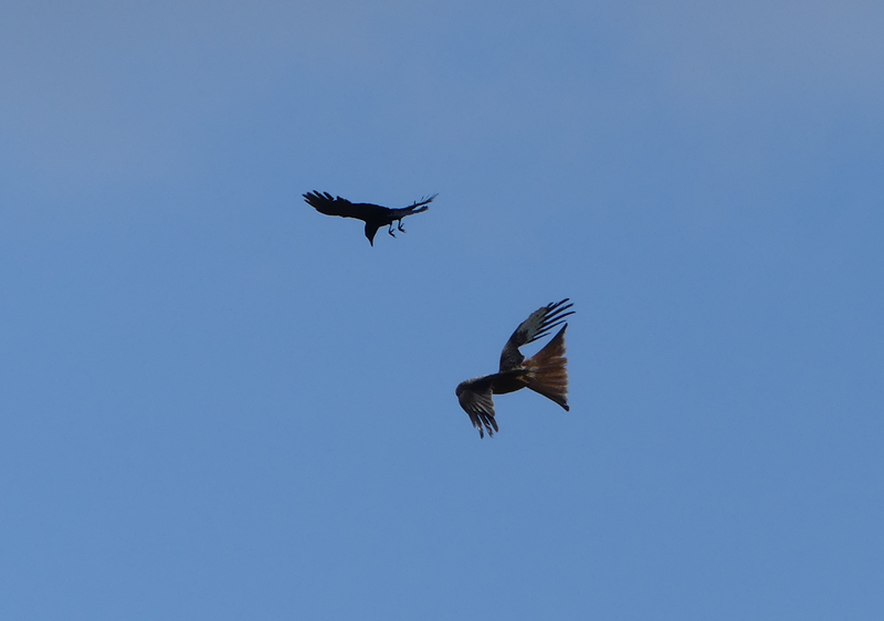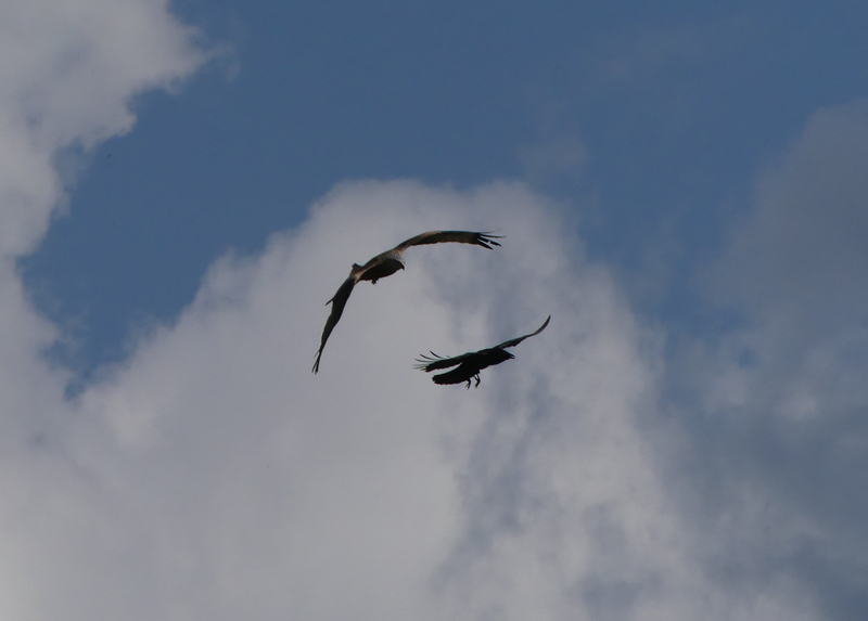 Ich schrieb das heute schon an anderer Stelle: Während der Gartenarbeit durfte ich spannende Luftkämpfe beobachten. Rings um den Garten nisten Raben und Milane. Etwa über uns muss die Grenze der Territorien verlaufen. Die Raben reagieren äußerst ungehalten, wenn der Milan das missachtet und sind damit auch erfolgreich - und erstaunlich ausdauernd. Ein paar Schnappschüsse davon sind mir heute mehr oder weniger gut gelungen.