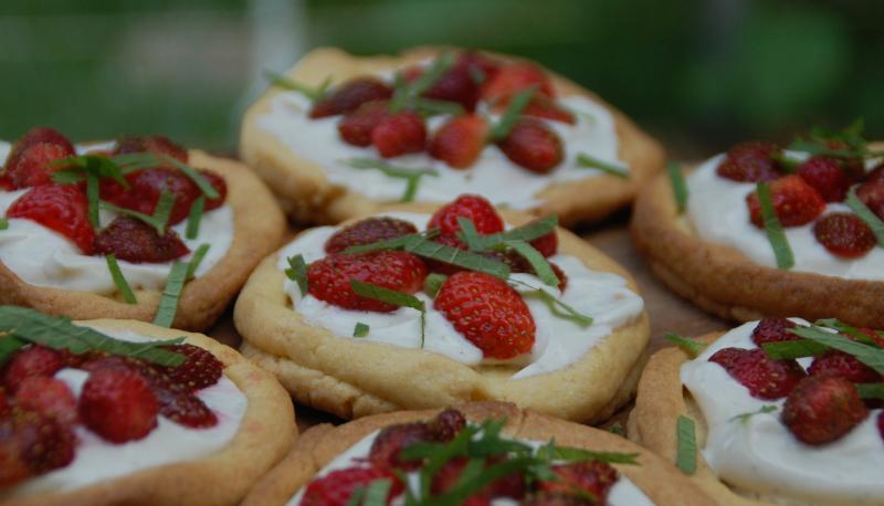 Nach dem Mittag knetete ich fix einen Mürbeteig, formte eine dicke Rolle und schnitt Scheiben ab. Auf jede Scheibe kam ein Rand und alles wurde gebacken. Nach dem Abkühlen kam eine Masse aus Quark, Sahne, Zucker und Vanillezucker drauf und Erdbeeren aus dem Garten