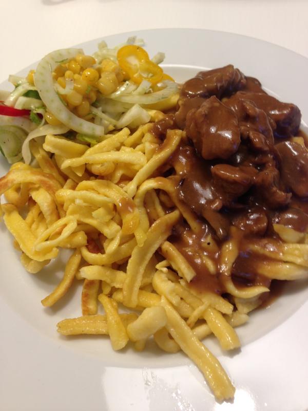 Hier gabs frosterreste. pilzgulasch, Spätzle und Salat