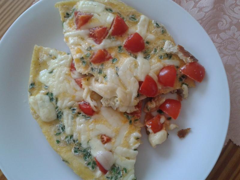 Hier gabs Omelette mit Zwiebeln, Tomaten, Käse und Schnittlauch