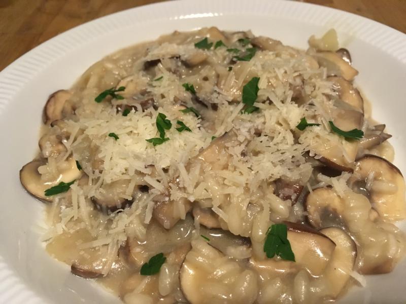 Risotto mit Champignons, aufgegossen mit Weißwein und Hühnersuppe und viel Parmesan. Ich habe mich irgendwie bei der Menge verschätzt, es waren fast zuviel Champignons und zu wenig Reis. ::) War aber gut :)