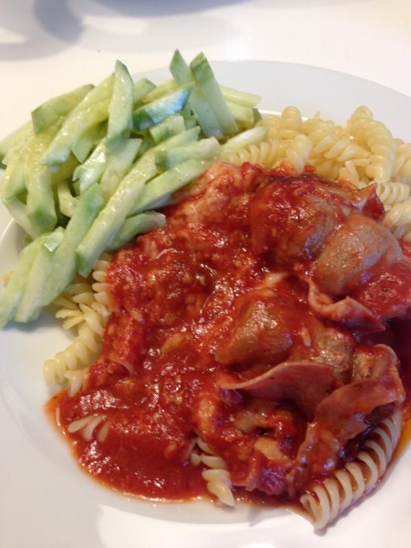 Hier gab es nach dem Kochmarathon am WE Spaghetti mit Tomatensugo aus dem Glas und nochmals Chiroreeradicioruccolasalat.