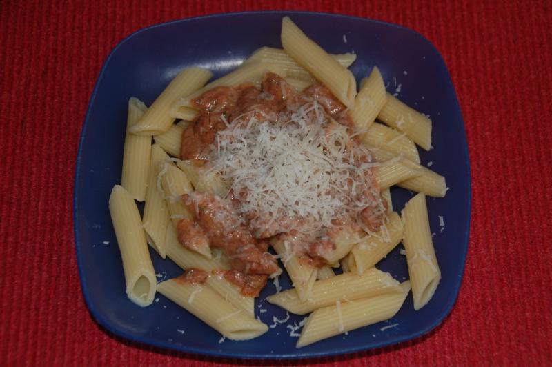 Penne rigate mit Olivensoße (Tomatenstücke, Olivenpaste, Creme fraiche, Kräuter, Salz)