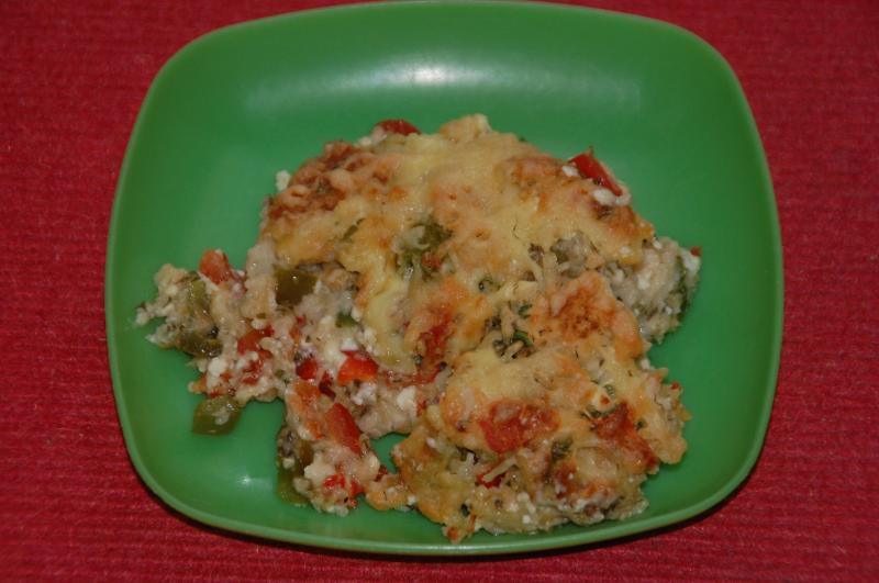 türkischer Brotauflauf aus Weißbrot, Milch, Paprika rot und grün, Tomaten, Feta, geriebenem Gouda, P&S, Petersilie, Koriandergrün und Dill